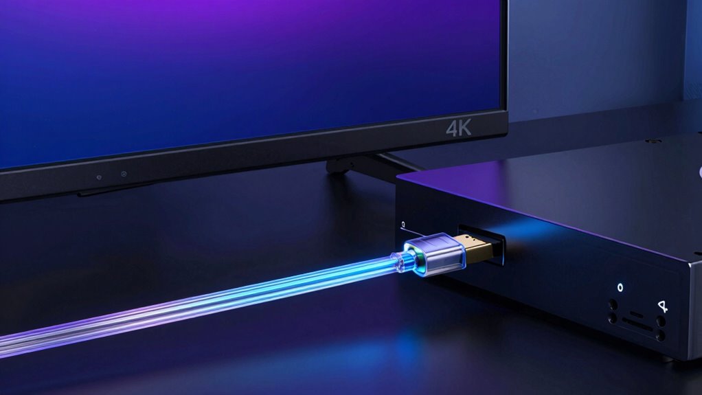 Fiber HDMI cables don’t require special connectors; they use standard HDMI connectors, making installation straightforward. However, don’t be fooled into thinking they’re as simple as plugging in a regular cable—connector compatibility and installation complexity can skyrocket with advanced fiber tech. You might find yourself wrestling with delicate connectors or specialized adapters, so be prepared for a slightly more intricate setup if you want to maximize those ultra-high-speed, long-distance signals.