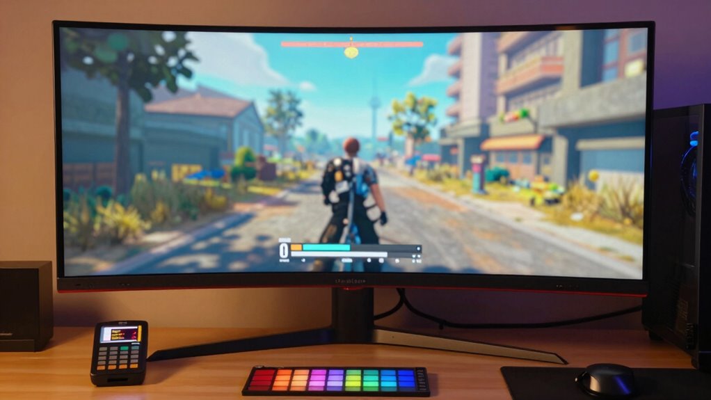 To make your HDR gaming visuals truly pop, calibrating the color settings for vibrancy is essential. Start by adjusting the color saturation and hue until colors appear lively but natural. Avoid oversaturation, which can make images look unnatural. Use a calibration tool or on-screen display to fine-tune these settings. For a clearer approach, consider the following table: