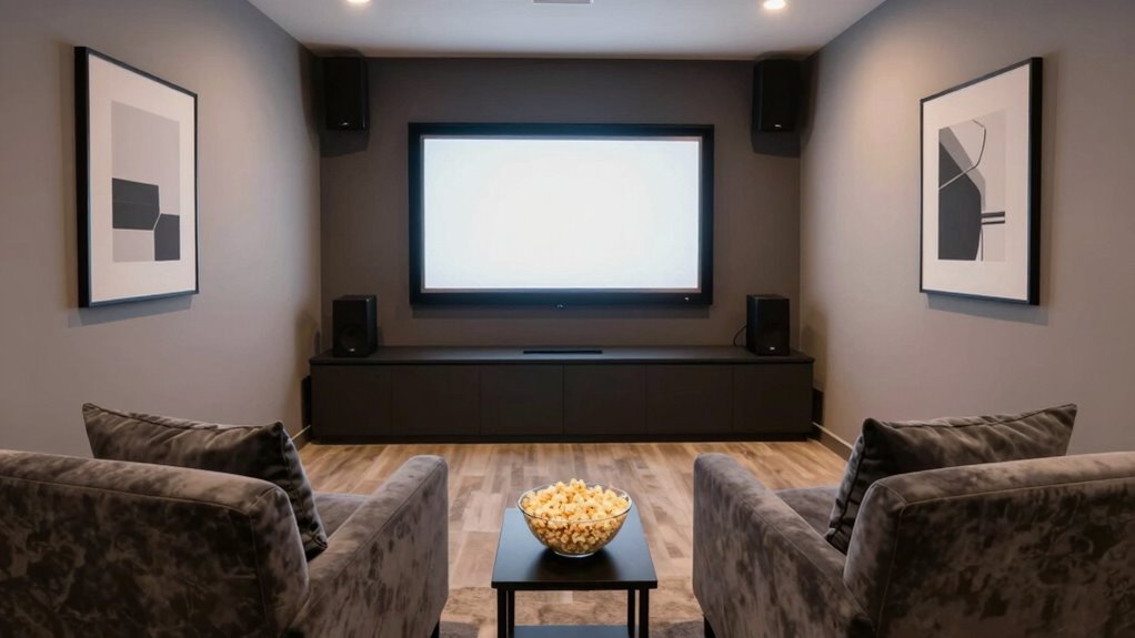 With the right equipment and smart placement, your home theater becomes a cozy oasis in a bustling cityscape, not a thunderstorm disturbing your neighbors. Acoustic treatments and volume controls act like gentle guardians, shielding your space like a soft, unseen blanket. Wireless devices and mindful setup turn your apartment into an immersive sanctuary—where sound flows seamlessly, like a peaceful river, creating movie magic without rocking the boat. Enjoy your perfect audio escape, neighbor-friendly and crystal clear.