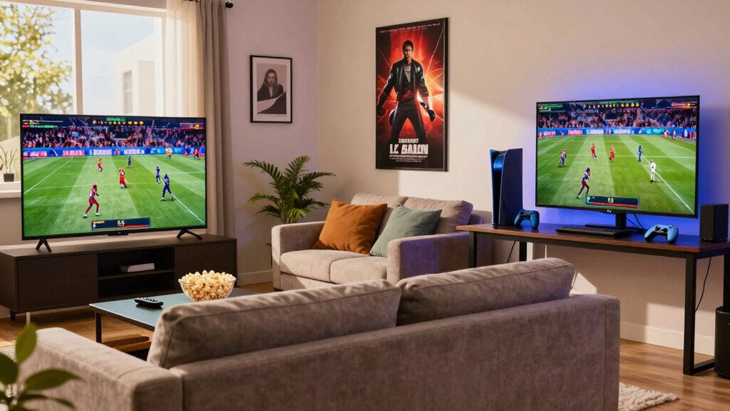 Think of your living space as a symphony, where each note—sports, movies, and gaming—needs its own harmony. You can achieve this by incorporating personalization options like adjustable lighting and seating zones. Technology integration, such as multi-functional screens and sound systems, allows seamless progression. This way, everyone’s favorite activity gets its moment to shine without overshadowing others, creating a balanced, vibrant environment that caters to all interests.