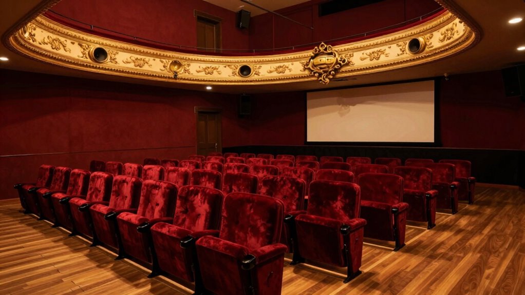 Theater designs influence your comfort through thoughtful acoustic insulation, which minimizes noise distractions, and appealing visual aesthetics that create an inviting atmosphere. When acoustics are well-managed, you experience clear sound without echo or interference. Beautiful visuals enhance your overall experience, making the environment feel relaxing and engaging. These design elements work together to guarantee you feel comfortable, focused, and immersed in the performance, making your visit enjoyable and effortless.