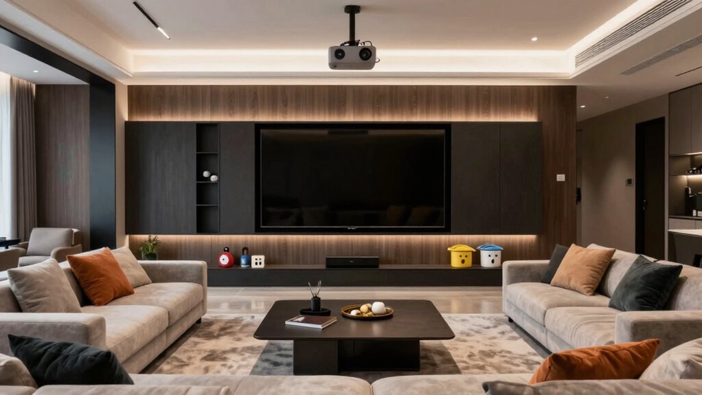 Next, you need to think about seating arrangements that balance comfort with style. You want your seats to invite everyone to settle in, but they also need to fit your room’s design. Consider plush, overstuffed sofas or sectional couches that can accommodate family members and guests comfortably. To keep the room looking cohesive, pick upholstery colors and fabrics that complement your overall decor. For a more flexible layout, incorporate a mix of seating options like recliners or loungers, which add a touch of luxury and versatility. Arranging seats in a slight curve or tiered setup can improve sightlines to the screen, making sure everyone gets a good view. Use side tables and cozy throws to enhance comfort and practicality. Don’t forget to leave enough space between seats for easy movement, and position them at the ideal distance from the screen—about two to three times the width of your television or projector screen. Proper seating arrangements create an inviting environment where family members can relax, chat, and enjoy movies together without feeling cramped or uncomfortable.