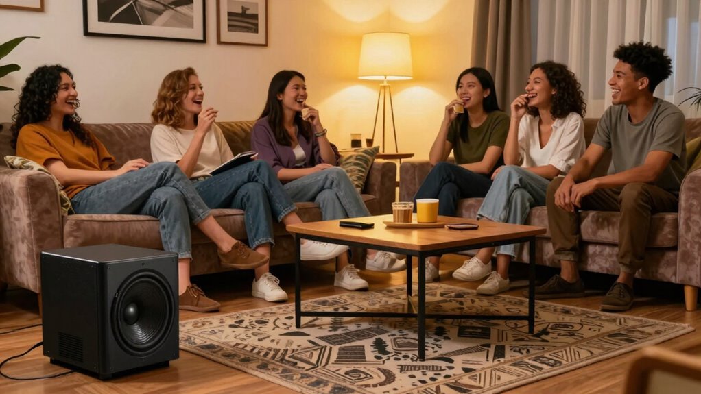 Your sound frequency perception also influences how you experience subwoofer sounds when you’re with friends. When others are around, the collective perception of bass can be altered because of the way sound waves bounce and interfere with each other in the room. You might find that the bass feels more punchy or boomy, or sometimes less clear, depending on how many people are present and where they’re positioned. The presence of friends affects not just the acoustics but also your personal perception. With more people, your brain processes the sound differently—more ambient noise, conversations, and movement can mask or emphasize certain bass frequencies. That’s why a subwoofer’s sound might seem to change depending on whether you’re alone or in a lively group.