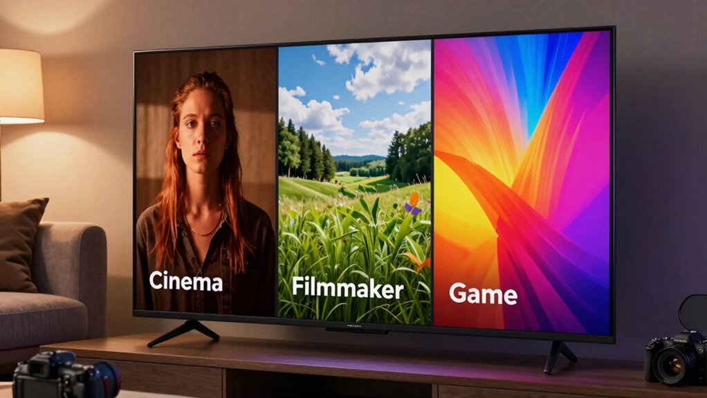Think of picture modes as different palettes for your viewing experience. Certain modes excel for specific content—Cinema mode offers rich color calibration for movies, while Game mode minimizes input lag for gaming. Switching modes is like changing brushes; it enhances your experience depending on what you’re watching. Choose your mode based on content type to get the best visuals, ensuring each scene pops with the right balance of color and clarity.
