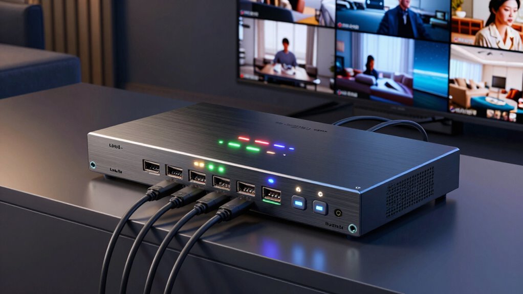 Did you know that over 80% of smart device issues are due to outdated firmware? I believe firmware updates are essential for peak performance and security. They fix bugs, improve compatibility, and patch vulnerabilities. Skipping updates can cause lag, signal dropouts, or security risks. So, I always keep my HDMI matrix switchers up-to-date, ensuring smooth multi-room video streaming and peace of mind.