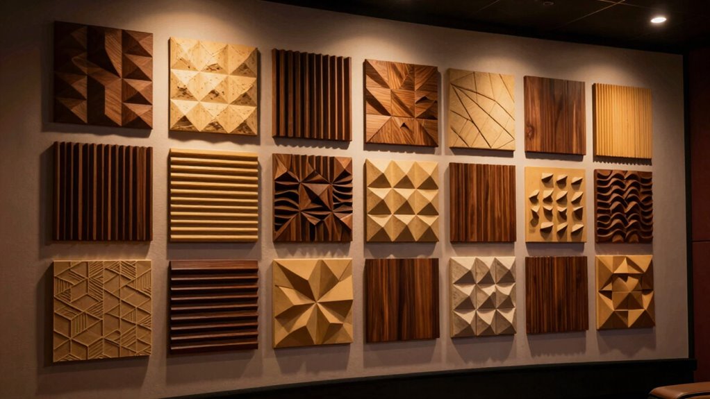 When choosing acoustic diffuser panels for your home theater, how they look matters just as much as how they sound. These panels come in a variety of designs and finishes that can blend seamlessly with your interior decor. You can select colors, textures, and shapes that complement your wall colors and overall style. Wooden or wood-like diffusers add a natural, warm touch, perfect for rustic or modern interiors. Geometric and artistic patterns not only diffuse sound but also serve as decorative focal points, enhancing visual appeal. Proper placement ensures they contribute to both sound diffusion and room harmony. Ultimately, choosing panels that match your aesthetic helps create a cohesive, inviting space that looks as good as it sounds.