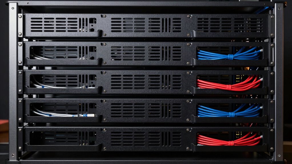 Choosing the right AV rack cable management tray starts with guaranteeing it fits your specific rack setup. First, check that the tray’s width matches your rack’s standard 19 inches. Next, verify the depth and height to accommodate your cable volume and available space. It’s important to confirm the mounting style, whether screw-in or clamp, works with your rack’s design. Additionally, consider the tray’s material and construction to support the weight of your cables and equipment. Finally, ensure the entry points and slots align with your cable types and routing needs. Proper compatibility prevents installation issues and ensures your cables stay organized and accessible. Taking these factors into account helps you select a tray that seamlessly integrates with your existing rack system.