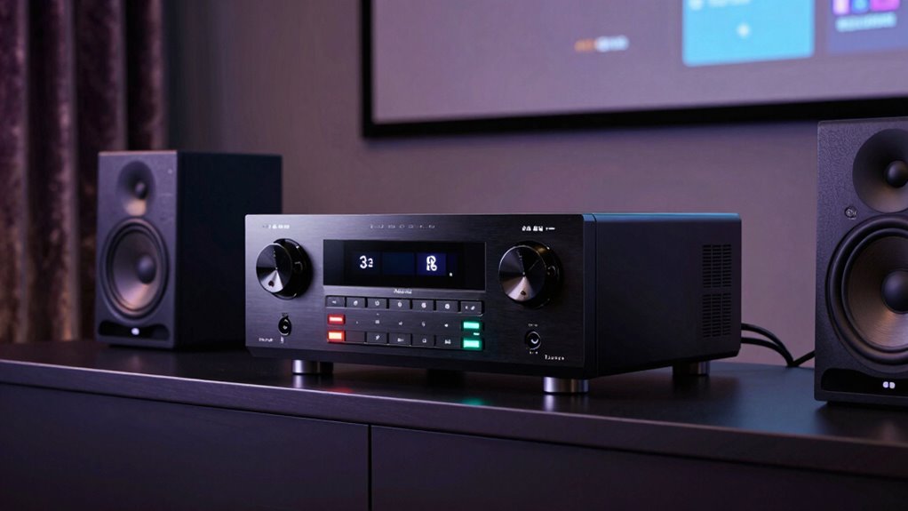Multi-room streaming capabilities expand the functionality of AV receivers, allowing you to enjoy your favorite audio content in multiple zones simultaneously or independently. When choosing a receiver, I look for support of standards like HEOS, MusicCast, Chromecast, or Sonos, which guarantee seamless multi-zone audio. Compatibility with popular streaming services such as Spotify, TIDAL, Deezer, and Pandora is also essential for accessing a wide range of music across different rooms. Built-in Wi-Fi, Bluetooth, or Ethernet connectivity is crucial for reliable wireless streaming. I also check for support of multi-room protocols that let zones either sync playback or stream different content independently. Finally, dedicated multi-room outputs and intuitive control apps make managing sources and volume levels in each zone straightforward and convenient.