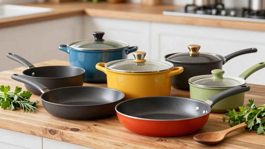 Good heat distribution is essential for achieving consistent cooking results, preventing hot spots that can burn or undercook food. Materials like multi-ply stainless steel or reinforced aluminum are designed to optimize heat conduction across the surface, ensuring even cooking. This is especially important for non-stick ceramic coatings, which perform best when heat is steady and uniform. Poor heat distribution can waste energy and make it hard to control cooking temperatures, leading to unevenly cooked dishes. When choosing a Caraway cookware set, evaluating its material construction helps you understand how well it transfers heat during various techniques. Proper heat distribution not only improves cooking performance but also extends the lifespan of your cookware by reducing warping and hot spots.