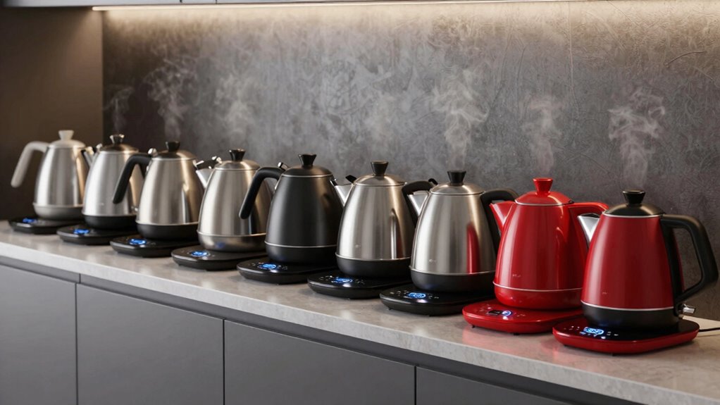 Think of these kettles as energy-saving wizards—they sip power instead of gulping it. I’ve found that many models with temperature control are surprisingly efficient, thanks to their smart heating elements and auto shut-off features. They heat only what’s needed, reducing waste. So, if you’re aiming to cut down on energy bills, these kettles are like little eco-friendly champions ready to keep your tea warm and your electricity bill in check.