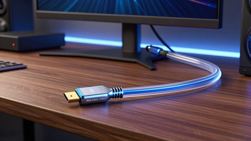 When choosing a fiber optic HDMI 2.1 cable, I consider several key factors to guarantee the best performance. Compatibility with my devices, signal quality, build durability, length, flexibility, and price all play a role in my decision. Understanding these points helps me pick a cable that meets my needs and offers reliable, long-lasting performance.