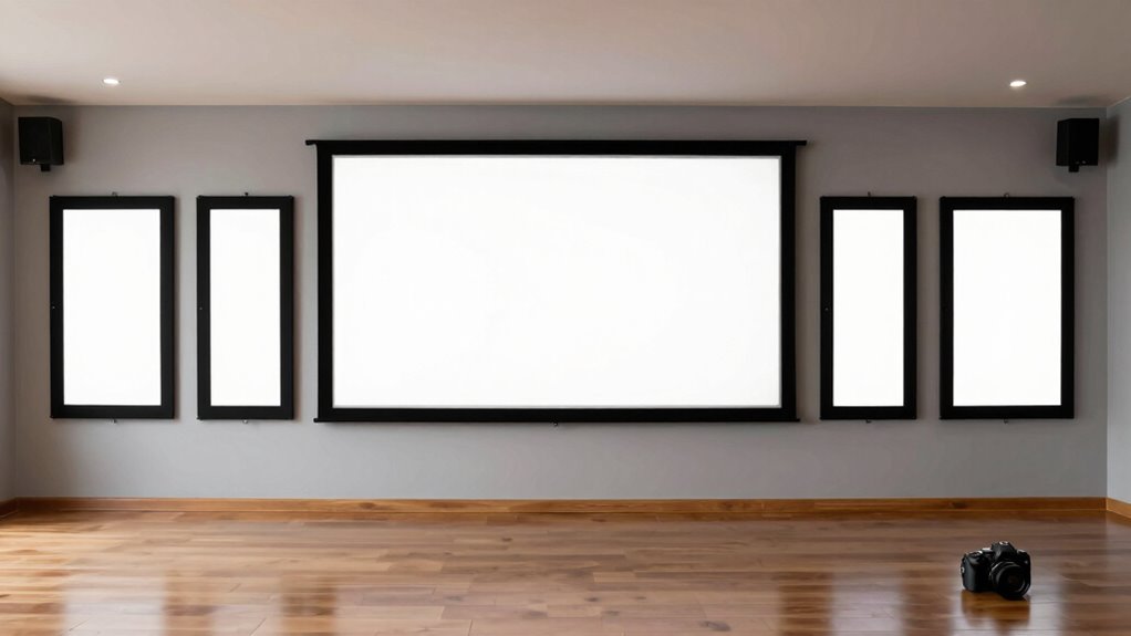 Ambient lighting conditions play a pivotal role in selecting the right fixed frame projector screen under $2000 because they directly influence image clarity and contrast. In bright rooms or spaces with lots of windows, you’ll want a screen with higher gain or ambient light rejection (ALR) features to combat light interference. Light-colored or reflective screens tend to wash out in well-lit settings, so opting for darker or specially coated screens helps boost contrast and visibility. Consider your room’s lighting setup—ceiling lights, lamps, or windows—and choose a matte or high-gain screen accordingly. Environments with uncontrolled lighting benefit from screens with wider viewing angles and higher contrast ratios, ensuring a clear picture from various seats, regardless of ambient light levels.