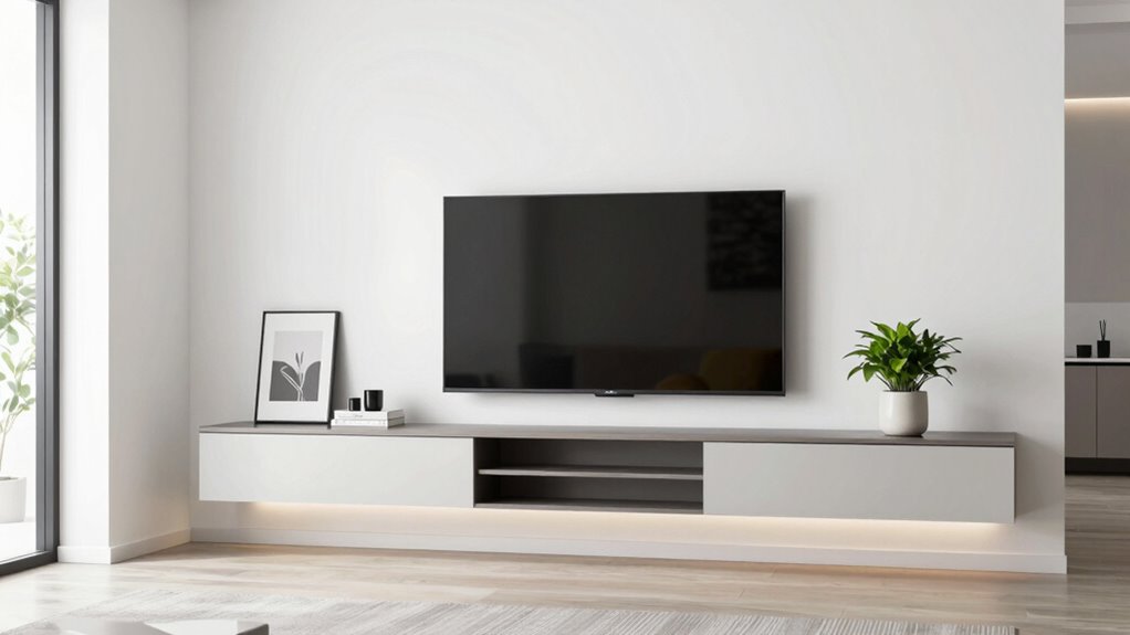Choosing a floating TV stand that looks good in your space means paying close attention to its design and how it complements your room’s decor. The style should match your overall aesthetic, whether modern, rustic, or minimalist, creating harmony rather than clash. Color and finish are key—high-gloss, matte, or natural wood tones can set the mood, from sleek sophistication to cozy warmth. Seamless, handle-free doors and hidden cable management help maintain a clean look, avoiding clutter. Adding integrated LED lighting can boost visual appeal and set the ambiance, whether cozy or vibrant. Finally, the stand’s shape, size, and decorative elements should align with your room’s proportions and themes, ensuring a cohesive, polished appearance.