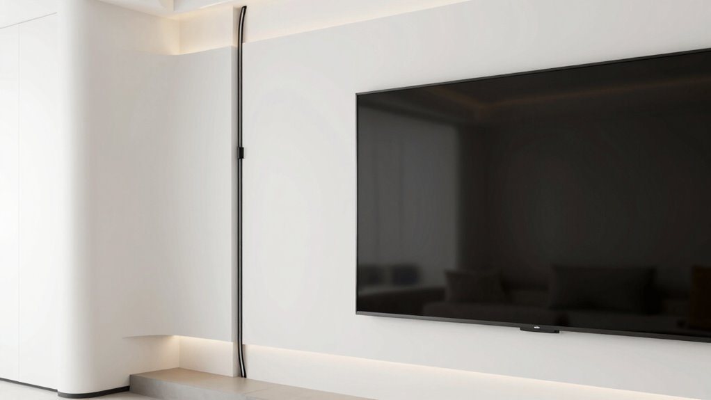 Aesthetic integration plays a key role in creating a clean, professional look for your mounted TV setup. In-wall cable concealment kits offer various design options, such as paintable grommets and wall plates that match your wall color for seamless blending. Many kits feature slim, recessed profiles—sometimes as thin as 2.17 inches deep—that sit flush against the wall, enhancing the overall appearance. Color-matching wall plates and covers allow you to customize and blend cables and outlets with different wall finishes and decor styles. Decorative elements like paintable grommets or neutral-colored panels help keep the setup unobtrusive. Additionally, options for protruding or recessed installation give you flexibility, ensuring your TV setup looks sleek and integrated regardless of your room’s style.