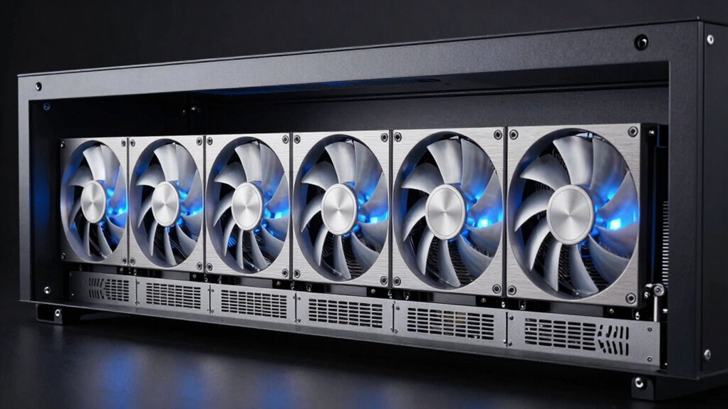 Choosing the right rack cooling fans hinges on understanding your equipment’s heat output and matching it with the fan’s airflow capacity. To do this effectively, you need to determine the total heat generated by your devices and select fans with the appropriate CFM (cubic feet per minute). For smaller setups, 20-60 CFM may suffice, while high-density racks can require up to 300 CFM. It’s crucial to match the fan’s airflow rating to both the size of your cabinet and the heat load, preventing hotspots. Additionally, consider the airflow direction to align with your cooling strategy, whether it’s top exhaust or front intake. If your environment varies, opt for fans with adjustable or variable airflow settings for ideal control.