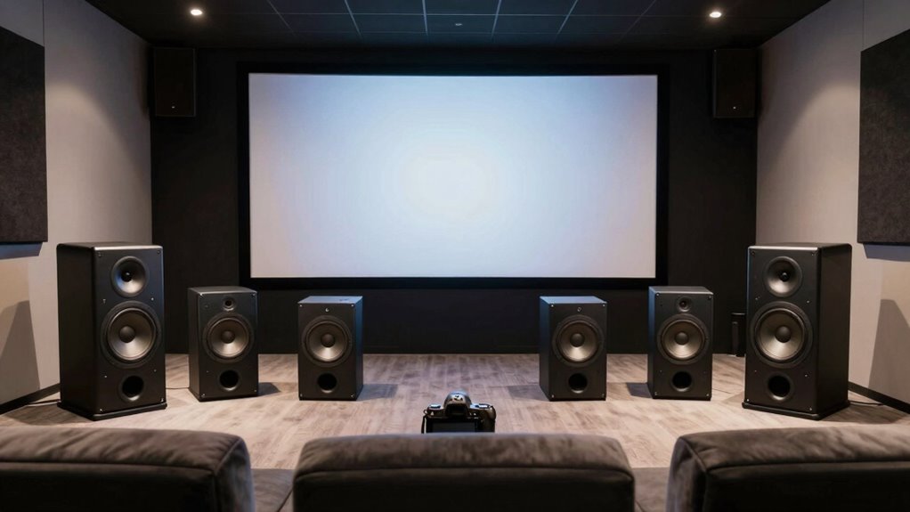 If you’re looking for the best speaker packages under $5000 for large rooms in 2026, I recommend considering systems like the Acoustic Audio 5.1 Bluetooth, Klipsch Reference Cinema Dolby Atmos, Rockville TM80W Tower, Avantree Harmony 2, Pyle Bluetooth PA Kit, and the Pyle Portable Bluetooth PA. Each offers powerful sound, versatile connectivity, and coverage suitable for large spaces. Want to see how these options compare and which might be best for your setup? Keep exploring!