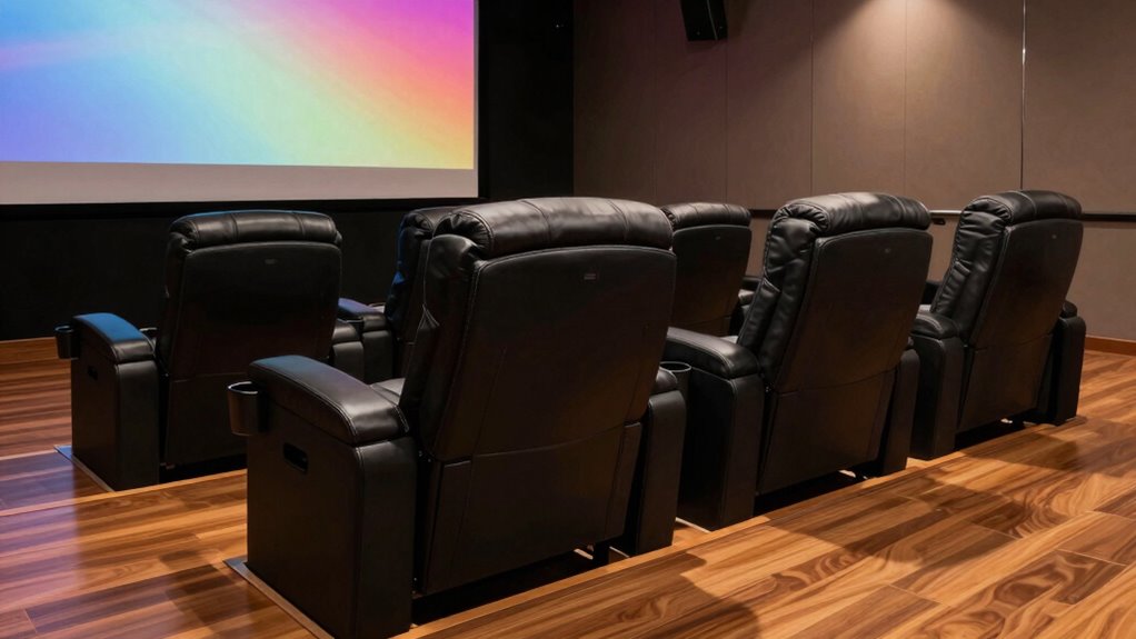 Material durability plays an essential role in guaranteeing your theater chairs with lumbar support last for years. Quality upholstery like high-grade PU leather or reinforced fabric resists stains, tears, and wear from daily use. Sturdy frames made from solid hardwood or reinforced metal provide stability and prevent wobbling or breakage over time. High-density foam padding maintains comfort without sagging, keeping the chair supportive and in shape even after prolonged use. Additionally, water-resistant and stain-proof materials help maintain the chair’s appearance and reduce cleaning needs, ultimately extending its lifespan. Choosing durable materials not only guarantees longevity but also ensures your investment remains attractive and functional with minimal maintenance. This focus on quality materials is vital for enjoying your theater experience for years to come.