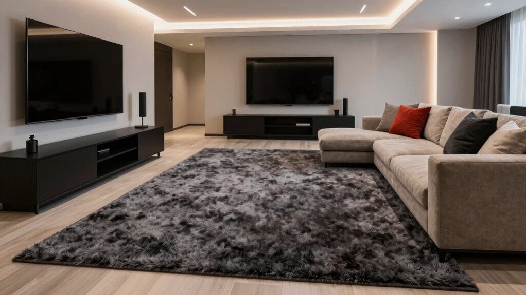 When selecting a thick area rug for your media room, I recommend considering durability and comfort to guarantee it lasts and feels good underfoot. It’s also important to choose the right size for your space, along with safety features like non-slip backing. Finally, think about maintenance, style, and how well the rug matches your room’s decor to make a smart, functional choice.