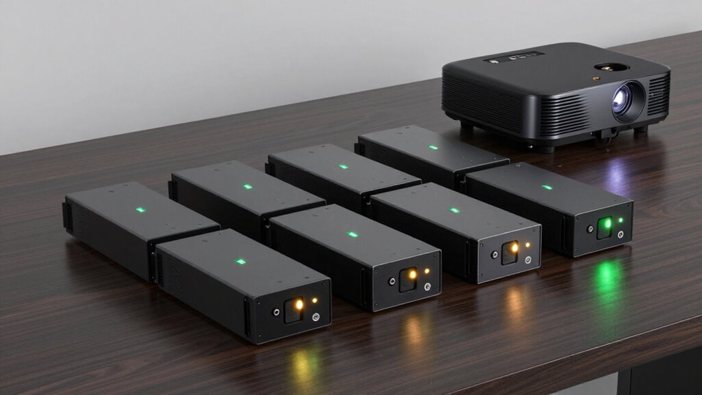 Yes, UPS systems can support multiple projectors at once, acting like a reliable safety net. I’ve seen setups where a single high-capacity UPS keeps several projectors running smoothly during power dips. Just keep in mind, the number of projectors supported depends on the UPS’s wattage and battery capacity. So, always verify the specifications to confirm it can handle your entire setup without missing a beat.