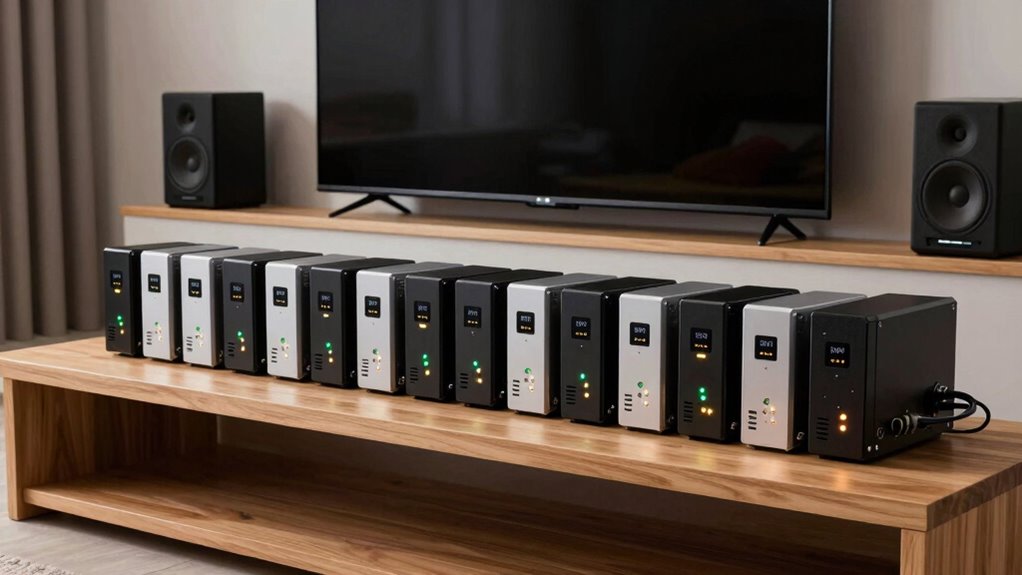 Choosing the right UPS under $500 is like finding a reliable anchor in a storm—it keeps your home theater safe and steady. With options ranging from basic surge protectors to advanced sinewave systems, you’ll find one that fits your needs and budget. Remember, investing in a good UPS is like giving your equipment a shield of armor, ensuring your movie nights stay uninterrupted and your gear stays protected.