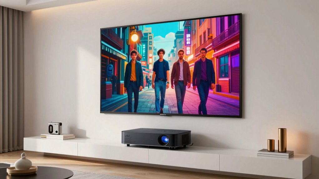 Choosing the right screen size for a UST projector involves understanding its throw ratio, which directly impacts how close the projector must be to the wall to produce your desired image. A lower throw ratio means the projector can create a large image from just a few inches away, making it ideal for small spaces. Ultra short throw projectors typically have a ratio of 0.2:1 or less, allowing big screens from minimal distance. If you increase the distance, the projected image size grows proportionally, so room size matters. An adjustable throw ratio adds flexibility, helping you tailor the image to your space. Ultimately, ensuring the maximum screen size fits your room’s dimensions is key to enjoying an ideal viewing experience without sacrificing clarity or comfort.